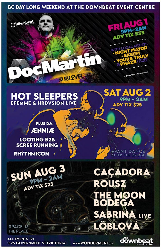 Sunday, August 3: 9pm-2am: featuring a live performance by Sabrina (Campbell River) plus DJs Caçadora, Löblová, Rousz and The Moon Bodega. Deep/Hypnotic/Psy-Tech/Techno.