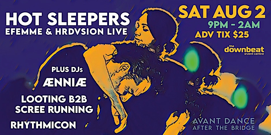 Saturday August 2: 9pm-2am: featuring a live performance by Hot Sleepers (efemme & hrdvsion) and DJs Ænniæ, Rhythmicon and Looting B2B Scree Running. Cross-Genre Avant Dance.